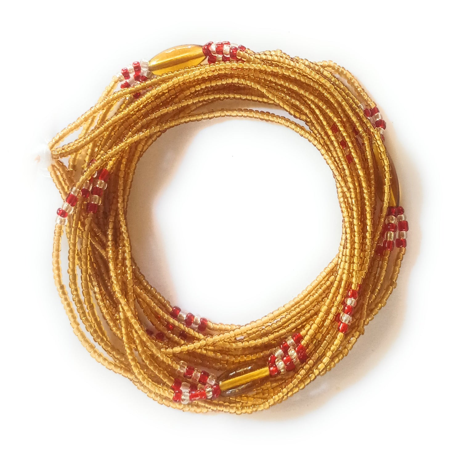 One strand of Gold 3-in-1 Style Tie-On Waist Beads. Each strand has Three smaller glass waist bead strands that come together at ONE larger accent bead.